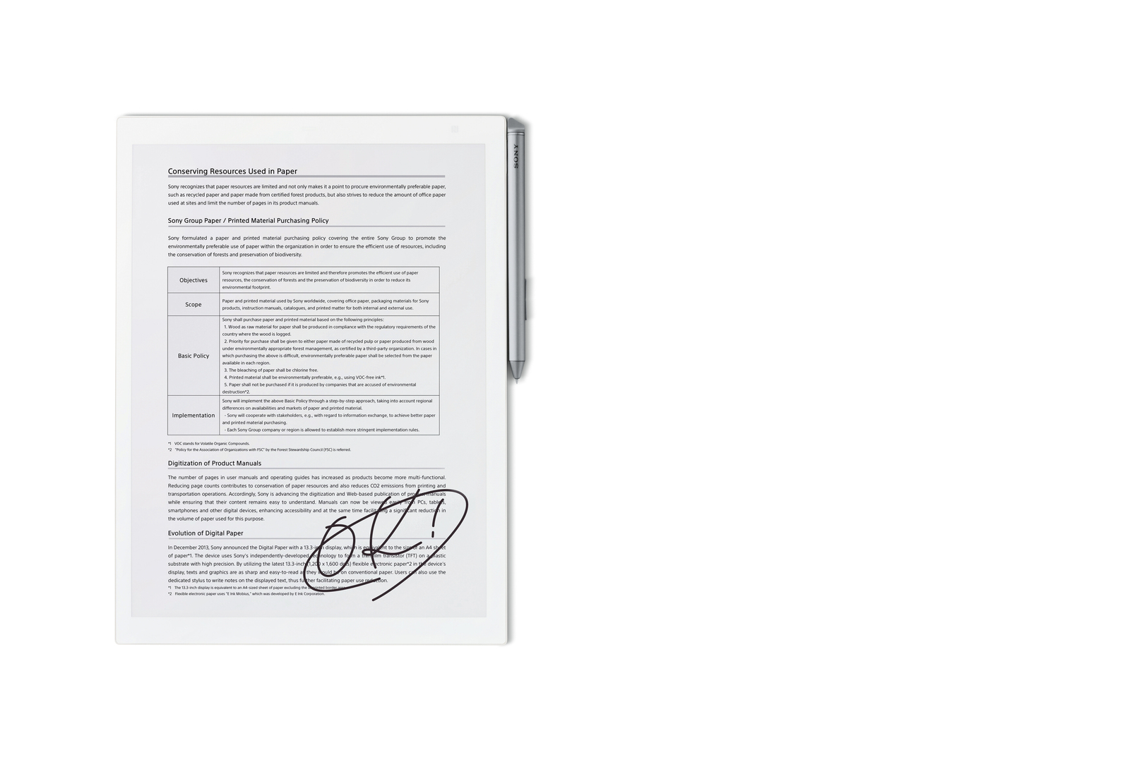 With a weight of only 349 grams, the DPT-RP1 e-paper display complements modern technology with the properties of paper. This is evident due to the paper-like surface, which conveys to the user an impression of writing on a real sheet of paper with a real pen. The network-compatible device creates A4-sized documents and is equipped with integrated memory storage to accommodate 10,000 documents. Therefore, it is suitable for anyone who wants to comfortably read and edit comprehensive documents, for instance professors or lawyers.