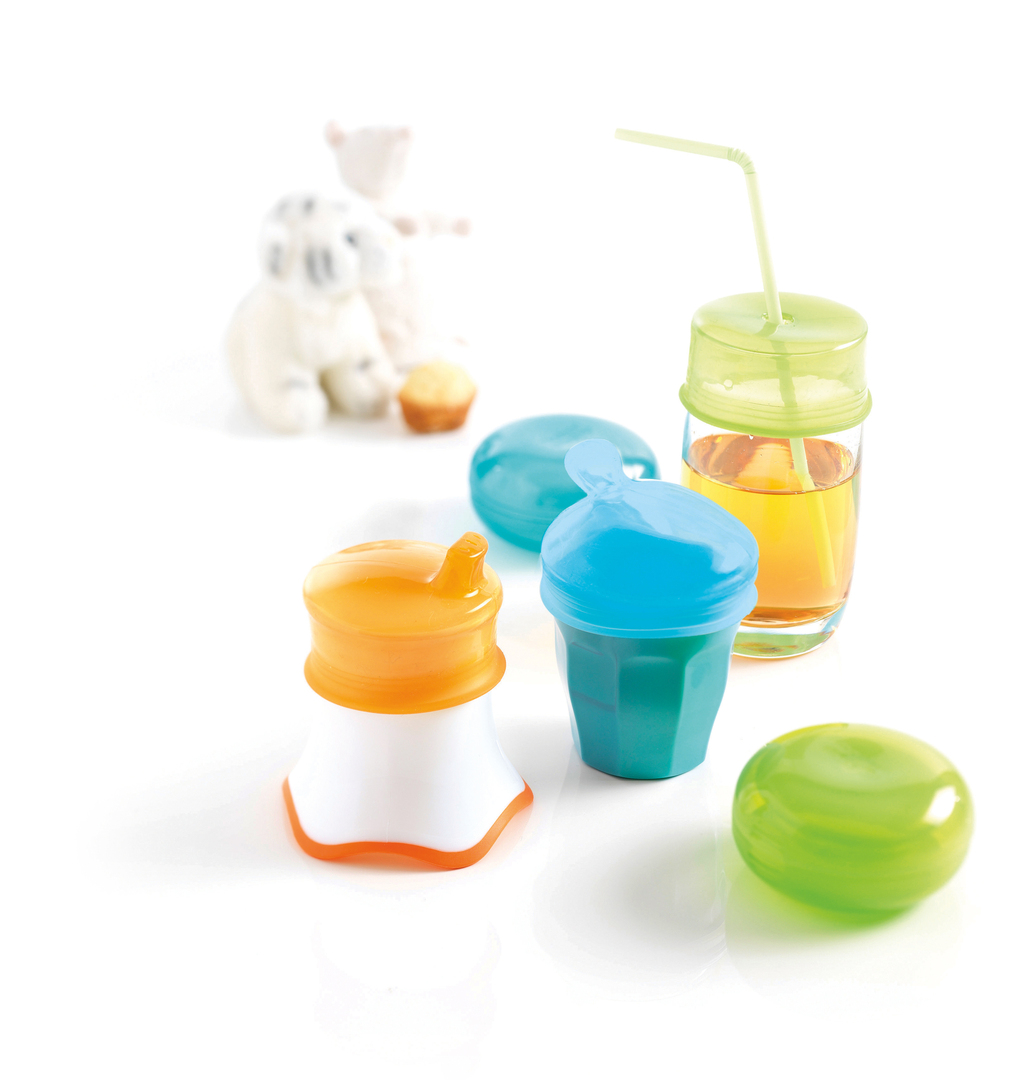 These 100 per cent soft silicone drinking caps allow babies to drink from normal glasses. Their flexible collar adapts to most drinking containers. They are available in three different shapes to follow the baby’s evolution (teat, spout and straw). The matt texture makes the stretch head easy to grip and to put in place. The products are watertight. Suitable for hot and cold drinks, they can be carried everywhere thanks to the little storage box.