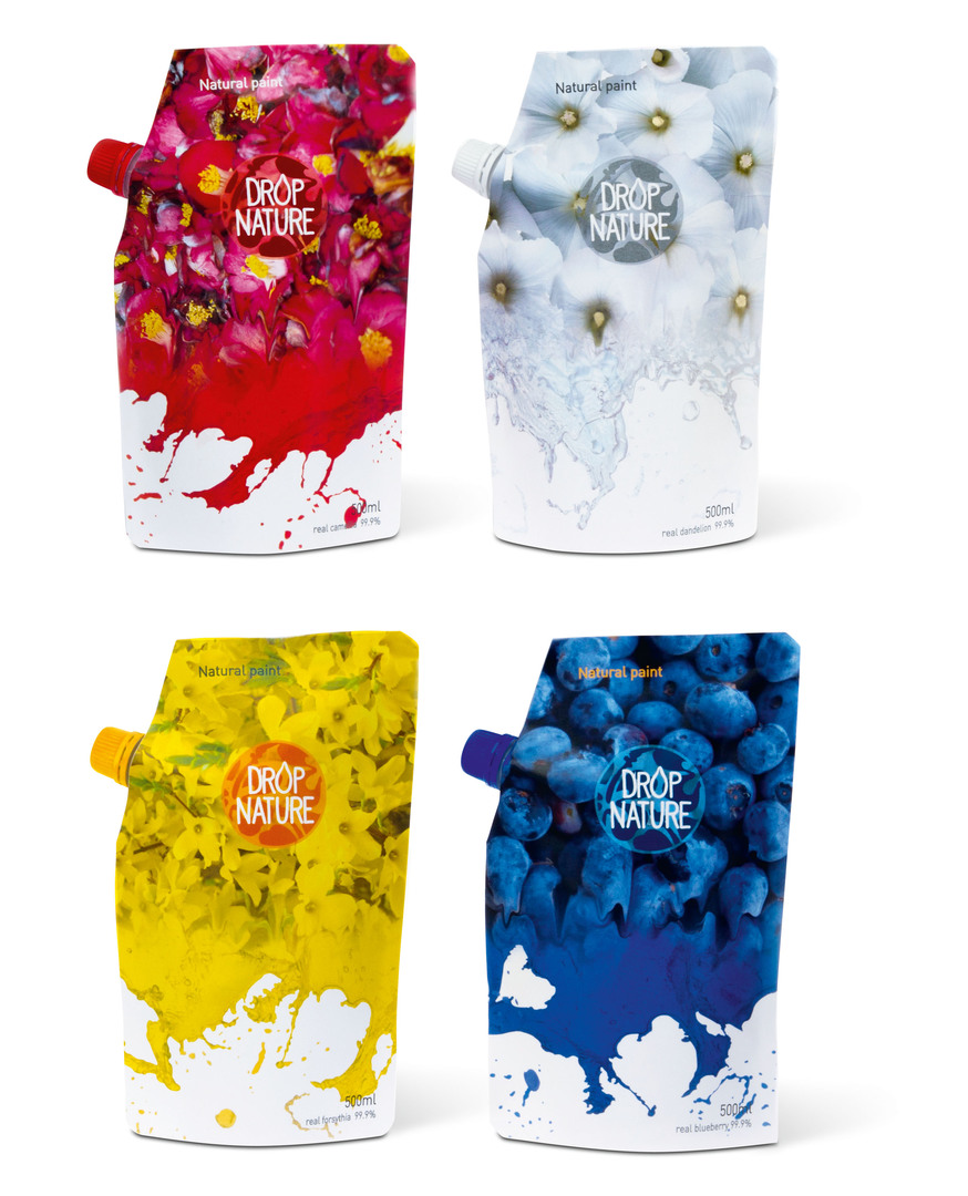 DROP NATURE convinces with this idea for a light packaging that not only communicates the overall ecological concept of the paints, but also stands out on the shelf among familiar-looking competitive paint cans and buckets. The way the design visualises this graphically by using plant motifs corresponding in colour is visually appealing and well implemented, leaving a strong and memorable impression.
