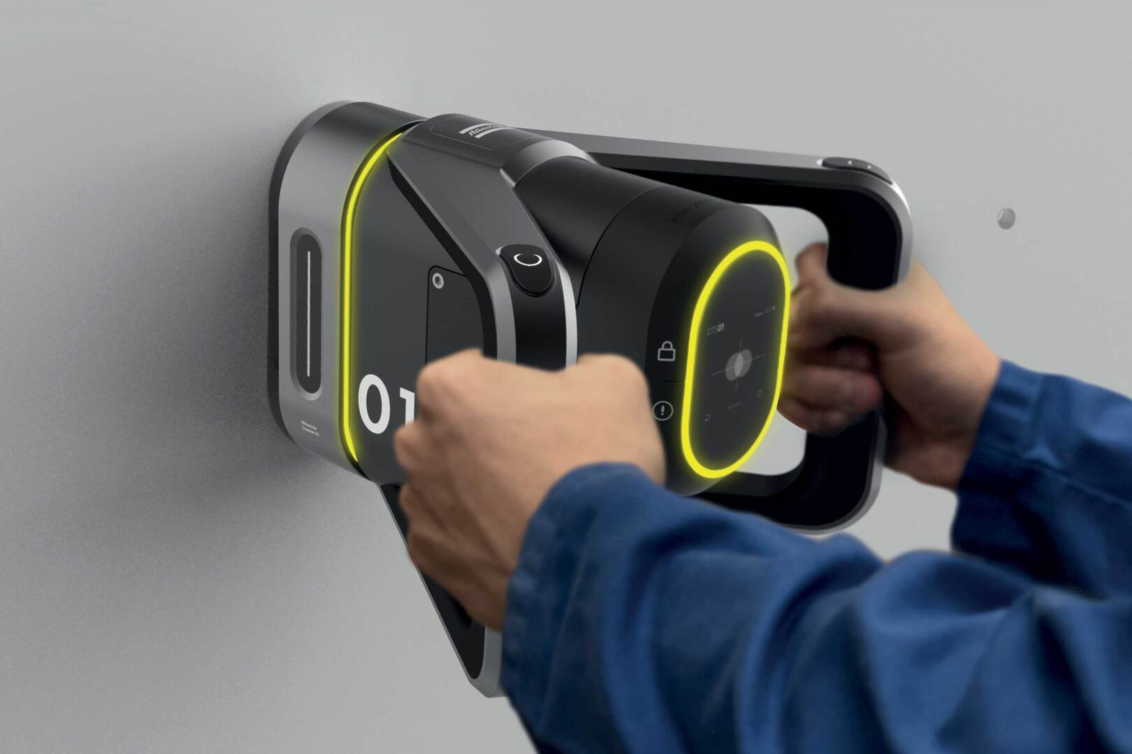 The product consists of two major units: the modular targeting unit and the drilling unit. The targeting unit uses ultrasonic technology to detect the location of holes on the exterior fuselage. The drilling unit locks onto the target and DTS 01 automatically drills the final hole without damaging the surface.