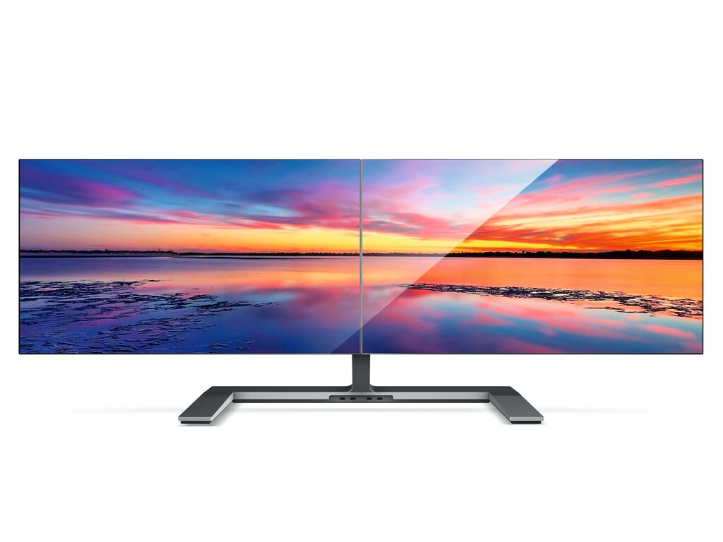 Du@t is an elegant-looking monitor with two screens that can be either used separately or seamlessly placed together to form an ultrawide screen. This is made possible by the extendable stand and two monitor arms, each of which can be individually tilted if two people want to work on the monitor at the same time. The stand with its integrated docking station is either attached to the tabletop or placed on the table.