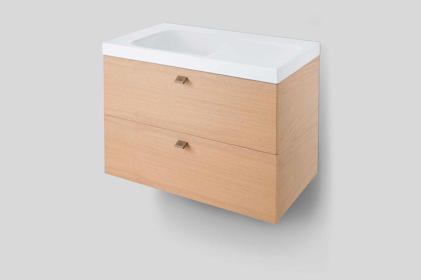 The design of this 36-inch lavatory is determined by a combination of soft and hard lines. The curved shapes of the washbowl and vanity blend seamlessly with the clearly defined edges. The DXV Modulus lavatory is also available as a compact 21-inch single bowl or as a 55-inch double bowl model. The oak veneer vanity can be optionally equipped with metal legs, while the drawers with their fine leather handles and integrated dividers provide ample storage space.