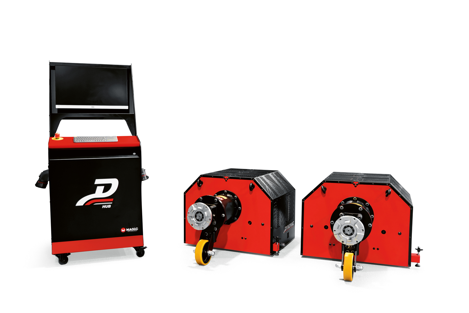 The Dynomag Hub is an automotive dynamometer for checking vehicle performance. It consists of a control unit and up to four compact hubs that can be easily connected to the wheel hubs. Flanges, bolt adapters and centring rings in various shapes and sizes are suitable for all common vehicles. Thanks to the strategically positioned wheels, the Dynomag Hub is easy to move despite its high weight. Special devices on and in the hubs ensure optimum heat dissipation.