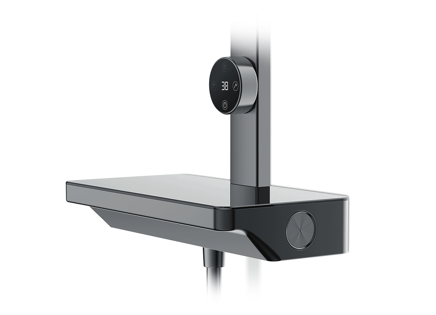 The E-control shower system was conceived for convenient operation. Its round, removable controller can be attached anywhere on the shower rail and also works remotely. Even outside the bathroom, it allows users to set the temperature and shower functions via a touchscreen with easy-to-understand pictograms. The digital display indicates the water temperature, which is additionally communicated through a colour scale.