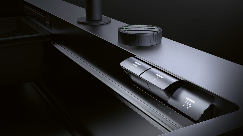 EK-1000 is a well thought-out kitchen sink that optimises space requirements in the kitchen by integrating various work modules and water systems. In addition to a slim faucet with pull-out spray, it also features a wide-jet shower for more demanding cleaning requirements. It is operated using three large buttons and the water temperature can be adjusted precisely using a rotary control. A concealed overflow reduces the build-up of dirt, while the particularly smooth surface has an antibacterial effect.