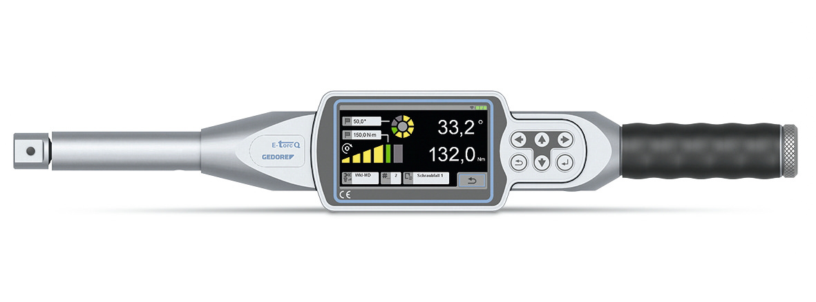 The E-torc Q electronic torque wrench comprises three models for controlled clockwise and counterclockwise tightening in the range of 10 to 300 newton metres. The screwing operation is displayed on the large and clear 4.3” colour touch display. The analysis of the screwing operations therefore can be carried out directly on the wrench. The high-quality and rotatable aluminium housing, as well as the ergonomically shaped handle, enables safe and easy use in every measuring range.