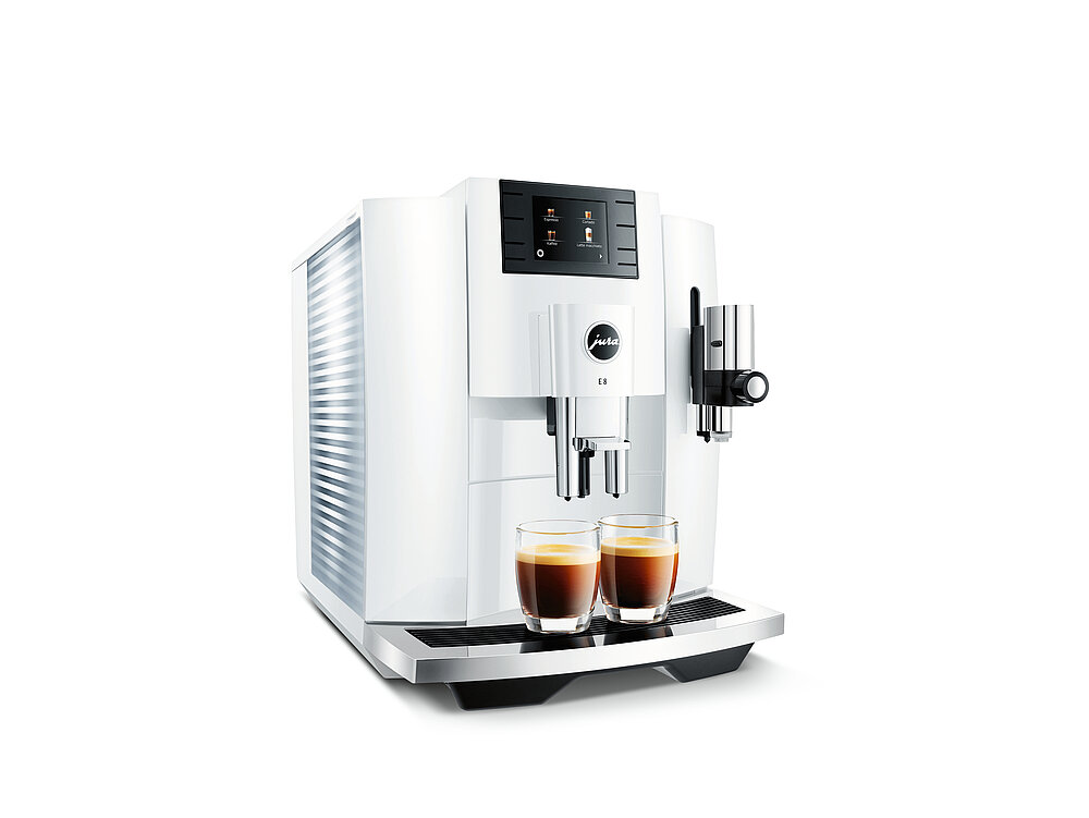The E8 Piano White is characterised by a high-quality overall concept. The clear design and details such as the grooved water tank or the chrome-plated cup grille help to create a sophisticated look. The automatic coffee machine can make 17 different coffee specialities ‒ from espresso to cortado. It also produces barista-quality milk foam at the touch of a button. It is controlled via a 2.8” colour display with six operating buttons. The automatic coffee machine can even be operated via smartphone or tablet thanks to its Bluetooth connection.