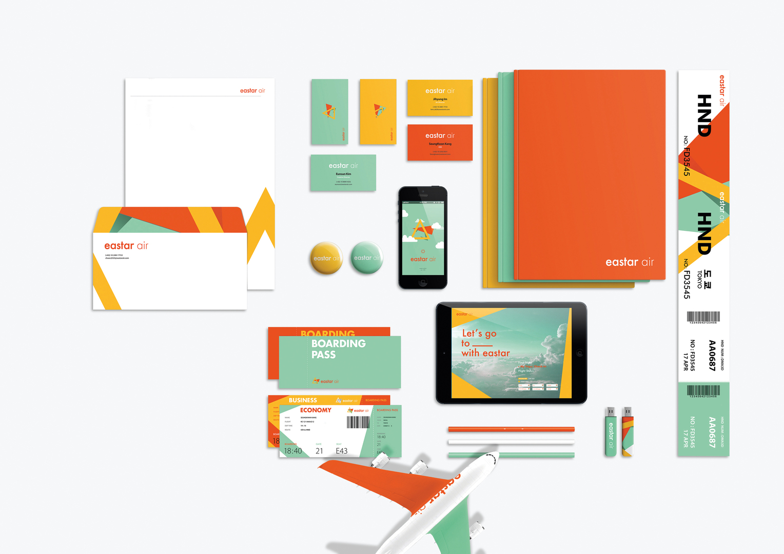 The corporate design for the airline “eastar air” comprises the development of the brand name, the logo and the attention-grabbing brand colours red orange, mint blue and yellow. The brand name represents the star in the east. The symbol of the airline has the shape of a star that consists of two triangles. Simple, graphical illustrations also characterise the advertising posters. The design of the stationery, tickets and lanyards as well as the web and mobile presence complete the corporate design.