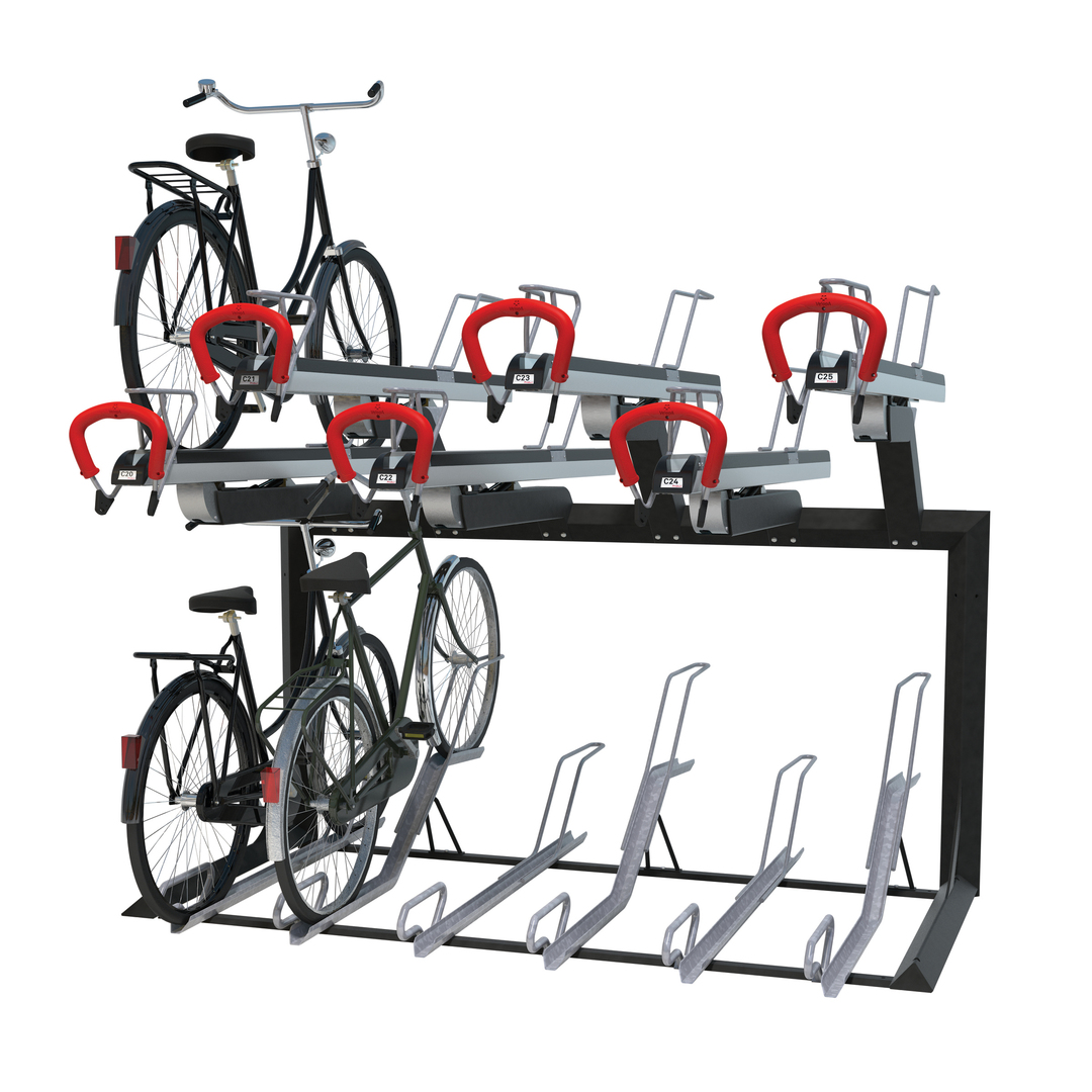 The Easylift+ is a space-saving, two-storey bicycle parking system that doubles parking capacity. Through its open design, the system is easily accessible, and since the wheel groove reaches right down to the floor, the bike barely has to be lifted when being parked. With the aid of an intuitively operated lifting and lowering mechanism, the bike may be effortlessly transferred to the top level and back down again. Its rugged and theft-proof construction allows the Easylift+ to be placed in unguarded, outdoor areas.