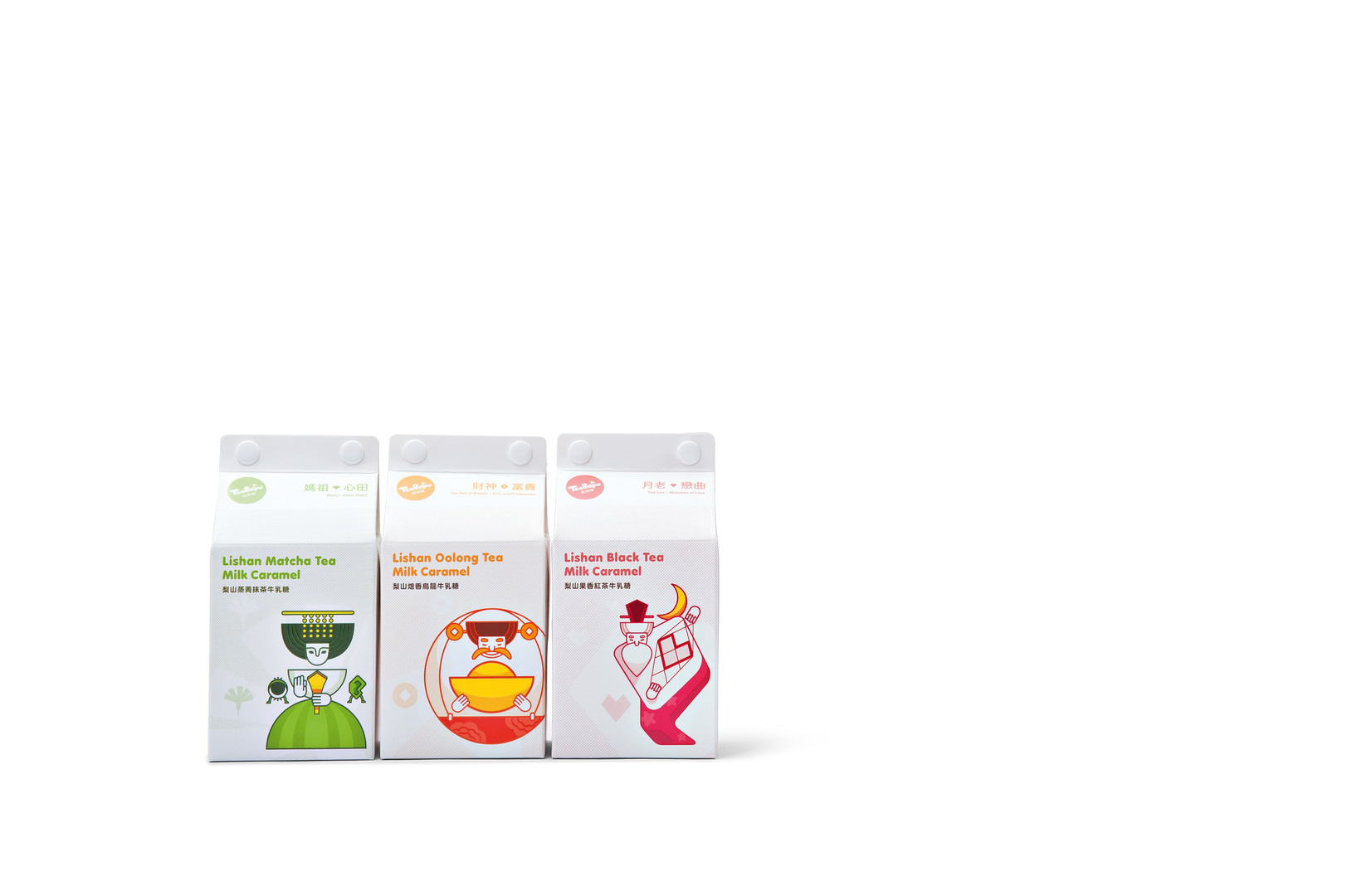Eatea120 is a tea brand with a name inspired by an old Taiwanese saying: “Stay healthy and live to 120.” The packaging design highlights the brand’s story and religious traditions, featuring three deities: the God of Wealth, the Sea Goddess and the God of Love. Taiwanese religious belief appears to come alive in the simple contemporary illustrations. Each flavour has its own key visual with a distinct colour, standing out clearly from the white box. Its milk carton design is an eye-catching match for milk candy, distinguishing it from similar products.