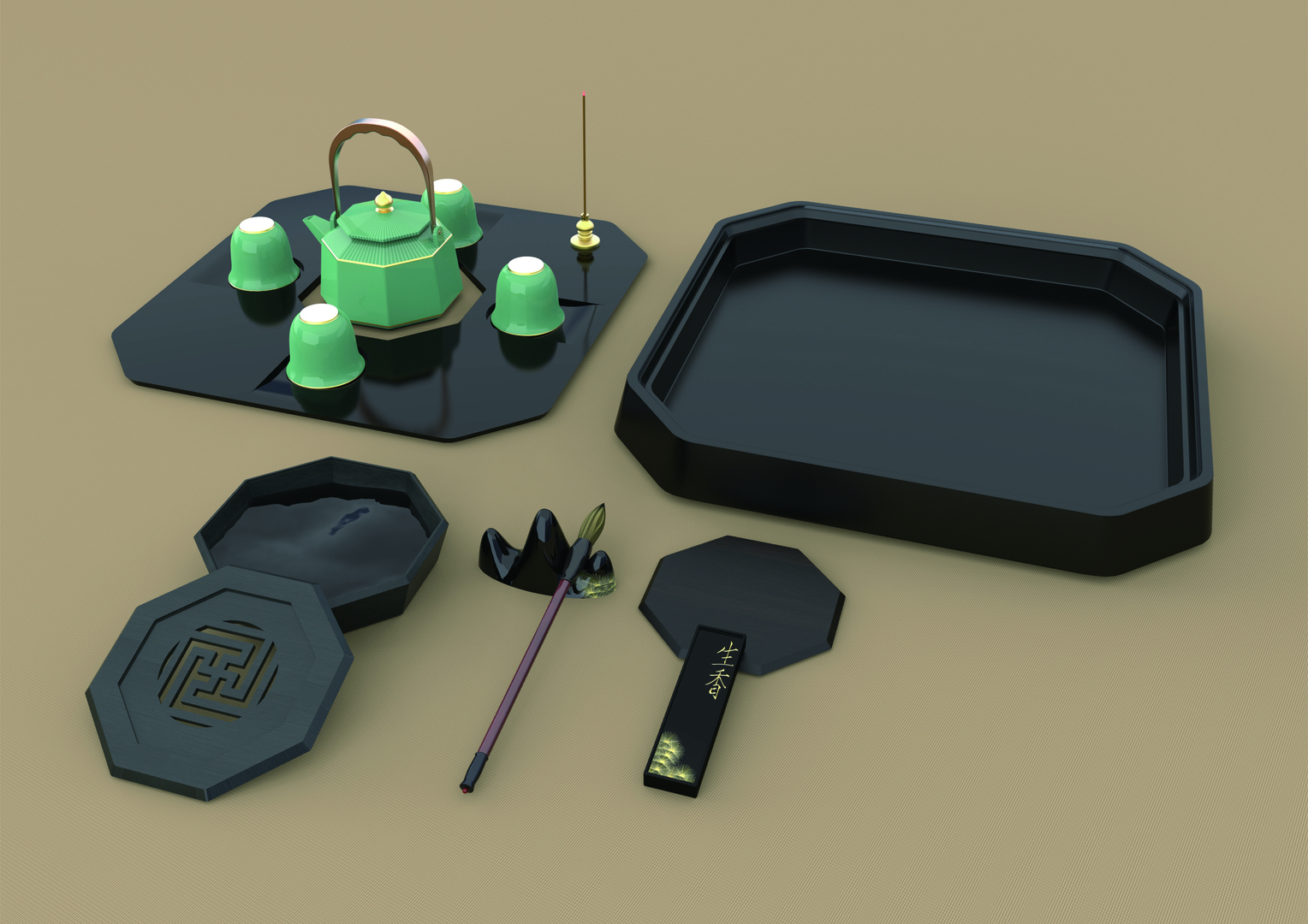 The pot and four cups are made of porcelain with celadon-glazed and metal-glazed ornamentation, reflecting the beauty and charm of a glazed pagoda. The teapot tray is made of warm red sandalwood that feels smooth as silk – it can serve as a pot tray or an ink slab cover. The table is made of "She Ink Stone" from Anhui province and carved with auspicious swastika patterns. This is one of the four most popular types of ink stone in China. The opening in the middle can be used for tea washing, preparing ink with pine ash, or burning incense. The design perfectly integrates ink slab, tea pool and incense plate into one product.
