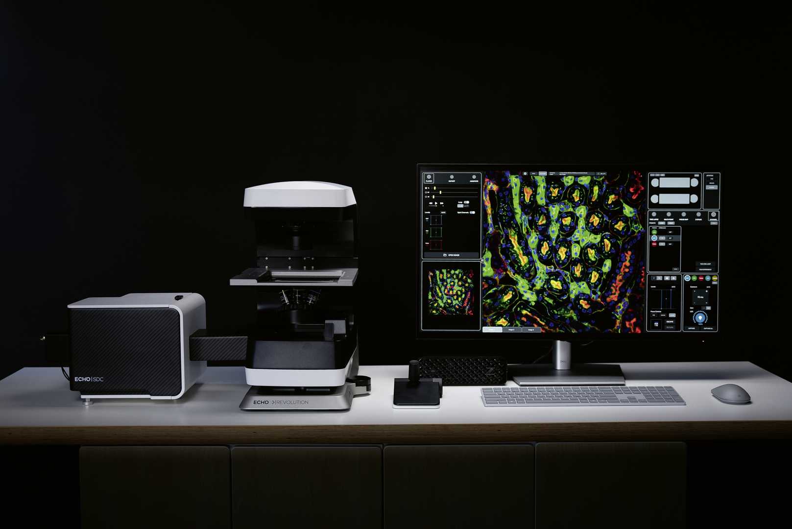 The ECHO Confocal microscope was designed to simplify microscopy and provide laboratories with a new design element. It blocks out-of-focus light and delivers high-resolution images. The device is gentle on samples, thereby minimising the risk of photobleaching and live cell damage. The traditional eyepiece setup has been replaced by a display, further enhancing the user experience. The simplified design and small footprint make the ECHO Confocal cost-effective and versatile.