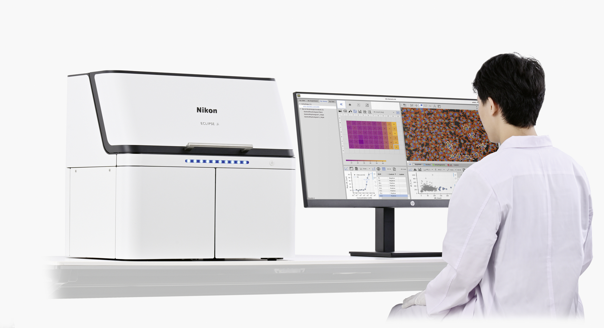 The ECLIPSE Ji is a digital microscope for drug research and development at universities and pharmaceutical companies. It enables rapid quantitative analysis and is easy to use. Thanks to its benchtop-box-style housing, the microscope does not require a darkroom and can be used in various environments. All operations are performed using a computer monitor, while AI defines acquisition settings and image analysis parameters. If necessary, the system can be upgraded for more specialised research purposes.