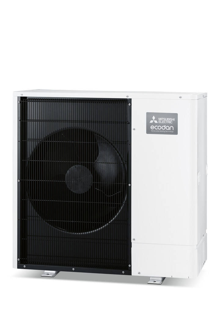 The outdoor heat pump unit of the PUHZ-AA ecodan series for residential air-to-water heating systems replaces conventional combustion boilers with an energy-saving, clean heat source and reduces CO2 emissions. Its housing is highly compact and slim, and the colour combination of white and anthracite exudes a simple yet elegant appeal. The dark colour of the fan section underlines the unobtrusive design. The large internal fan runs very efficiently at low speed, ensuring lower noise emission.