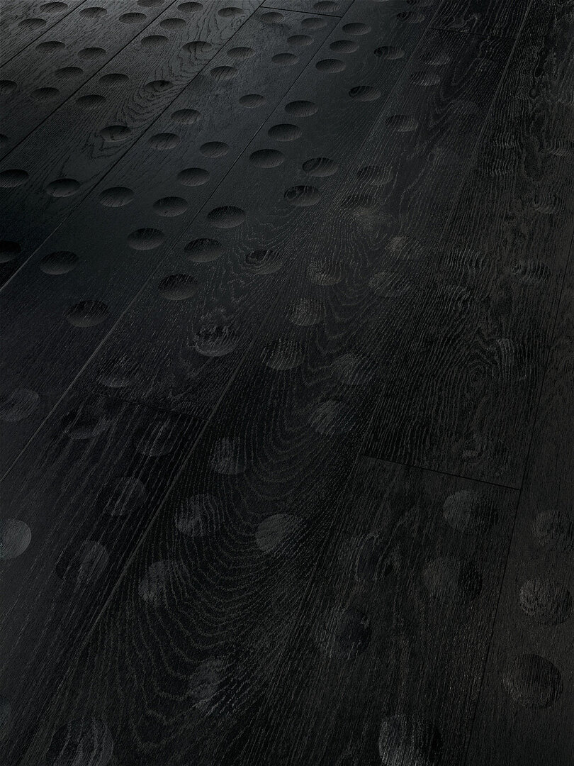 Robust and elegant oak is used for the production of the flooring NEA of the Floor Fields Design Edition by Alfredo Häberli. Very shallow, round, geometric milled patterns decorate the wood flooring. Relief structures and clear contours create a feature and highlight individual motifs. As the light changes, the look and effect of the flooring is significantly different. The irregular contours and distinctive, discreetly visible patterns in stained black oak make the flooring particularly elegant.