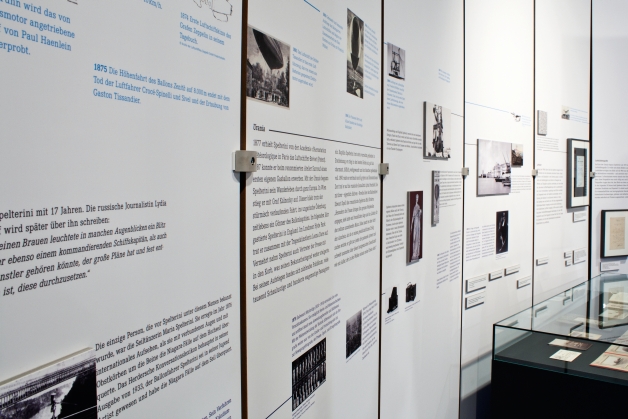 Every year the Zeppelin Museum Friedrichshafen hosts an exclusive technology exhibition on historical and art historical aspects of aviation. For that reason, the oeuvre of Swiss balloon pioneer Eduard Spelterini was staged for the first time in 2010. The exhibition addressed a broad public and was divided into an informative as well as a visual part. Newspaper walls, arranged like a circus ring, presented the life and work of Spelterini, in the context of a continuously developing aviation industry and photo technology. Spelterini’s photographs, which were taken from a balloon, were presented on specifically developed displays. That way, visitors gained visually fascinating insights into a world seen from above.