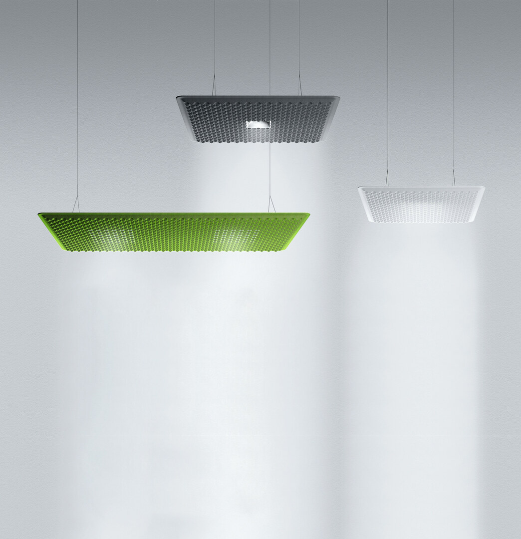 With its design reminiscent of egg cartons, the Eggboard pendant luminaire creates a new form of lighting. Featuring a double functionality, it changes the perception of any given space in an interesting manner. The way it integrates the LEDs into the complex surface is highly fascinating. This pendant luminaire reduces the sound level in spacious rooms and exudes a presence that impresses beholders with its futuristic appeal.