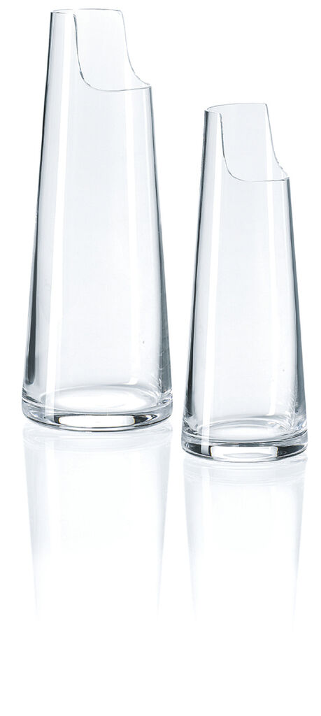 A characteristic design distinguishes the mouth-blown carafe series with particularly striking contours. With Character Diamond, the naming is targeted on the manufacturing method of the carafe: a two-stage opening of the vessel is manually produced by means of a special cutting technique. Due to its cutting angle it grants drip-free pouring. When this manufacturing technique is employed, a particularly steady and experienced hand is required to bring about the desired effect. The pleasingly harmonious lines of the carafe communicate an overall picture of minimalist lightness. They charmingly correspond with the incidence of light on the glass. The carafe is available in two different sizes with a capacity of 500 ml and 1000 ml respectively. It is part of a comprehensive product line with five different glasses.