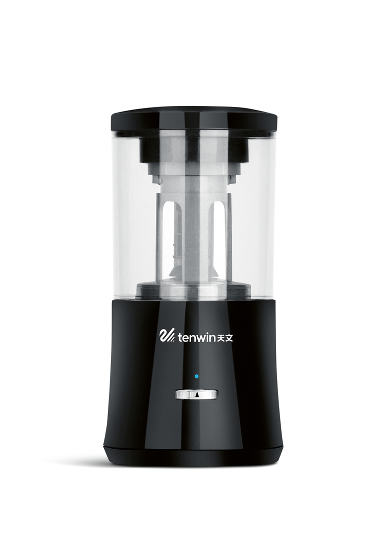 The product has been developed for sharpening standard graphite or colour pencils and features an innovative auto-feed and auto-eject mechanism. As soon as a pencil is put into the entrance hole, it is pulled in automatically and rotated to be sharpened, before it is automatically ejected. It enables both children and adults with limited grasping capacity to sharpen pencils without any problems. The opening can be adjusted to the circumference of the pencil to be sharpened.