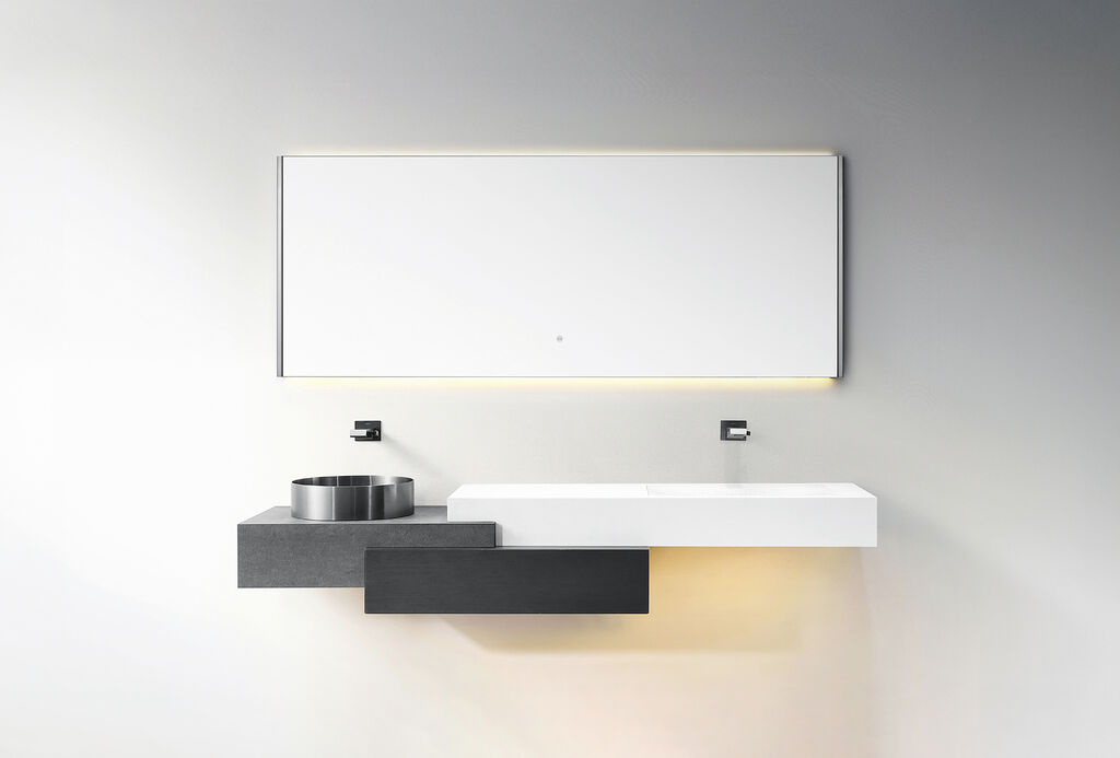 The Elegant Scenery bathroom cabinet set includes two washbasins with a separate cover, as well as a mirror with touch-sensitive lighting. The stacked and seemingly interlocking ensemble of individual elements gives the arrangement an architectural aesthetic that is visually accentuated by the combination of multilayer solid wood, natural stone, stainless steel and Corian, each with its own colour scheme. A drawer with a clearly structured interior allows for the organised storage of cosmetics and care utensils.