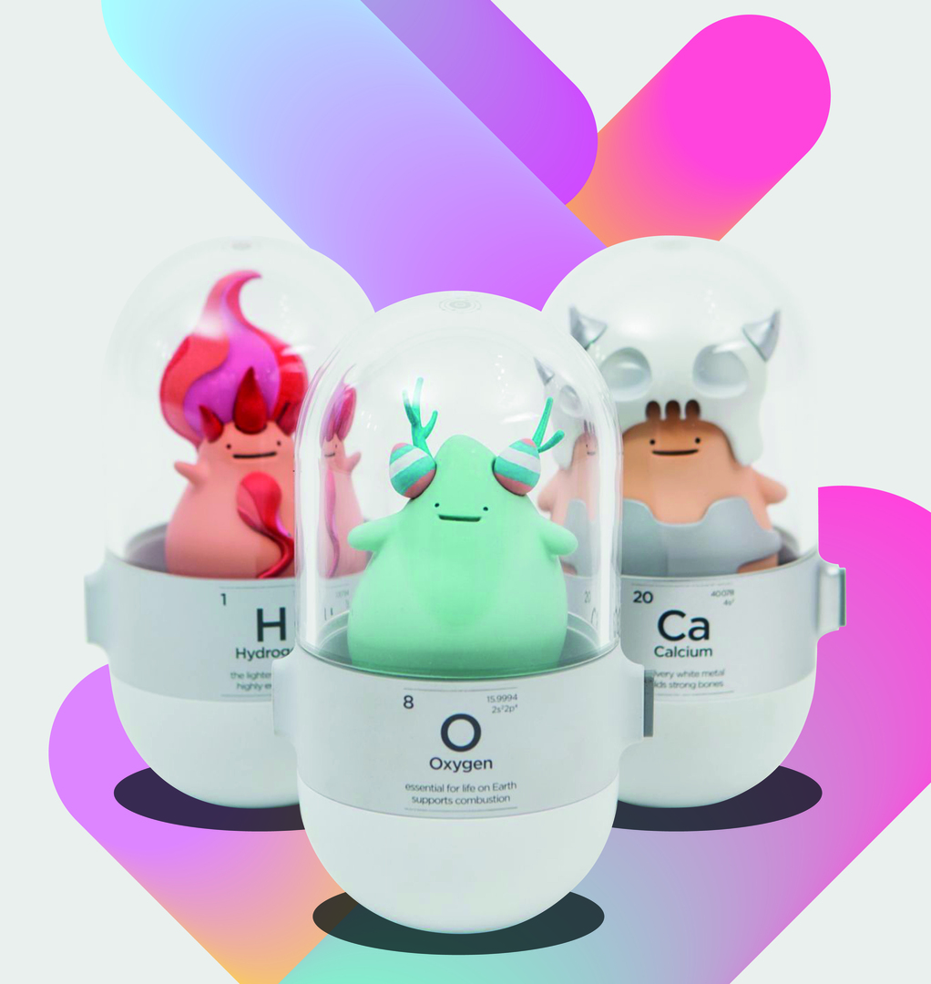Chemical properties are not noticeable physically, but students are often required to memorise periodic tables in school. The designers asked themselves, “What would be a more fun and creative way to understand chemistry instead of cramming our brains with periodic tables?” The world consists of elements, and hence chemistry can be made more relevant by showing how it is ever-present in everyday life. The user can learn about the elements, molecular binding and chemical reactions through an Augmented Reality (AR) application, which makes the learning process more enjoyable. The 118 elements are visually represented by interesting characters, and the chemical properties of the elements are communicated using different colours, shapes and facial expressions that are incorporated into the character designs. For example, Hydrogen is the oldest element in the universe and has explosive properties. As such, the Hydrogen character is designed with a long beard, horns and flaming red hair. All the element characters are individually packaged into Capsules with its chemical name, number, properties, atomic weight inscribed. This also serves as a marker for AR application. The material used for the band in the middle of the capsule indicates if the element is a metallic or non-metallic one. Both sides of the structure are magnetic, making it possible to attach the Capsules. When one element is physically attached to another, a video clip will show how both elements combine to form a new matter. These combinations can be saved in application’s archive and reviewed at a later time.