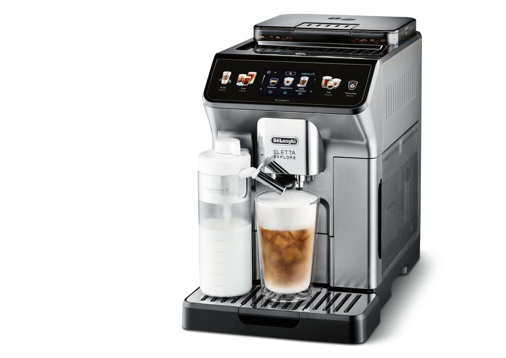 Eletta Explore is a fully automatic coffee maker with a sleek design that offers users a special variety of coffee specialties. Drinks with hot or cold frothed milk, for example, can be prepared using the LatteCrema Hot and Cool Technology. The appliance is controlled via an intuitively designed colour display with soft-touch control. In addition to a dedicated app with numerous recipes, the use of the Eletta Explore is enhanced by a to-go feature or useful accessories such as a coffee pot.