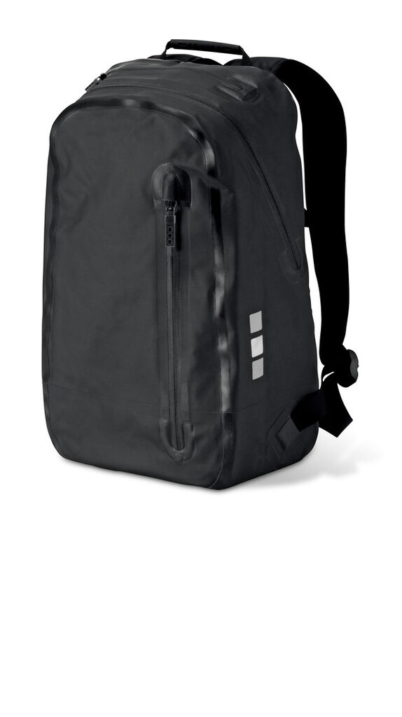 Nylon material with double-sided coating, welded seams, special zip fasteners and a roll-top closure make the Elevate Waterproof Ziptop Backpack entirely waterproof. The bag provides additional space in various compartments and pockets, including one detachable extra pocket on the shoulder strap for smartphones. The ergonomically shaped padding of the backpack ensures comfort and relieves strain.