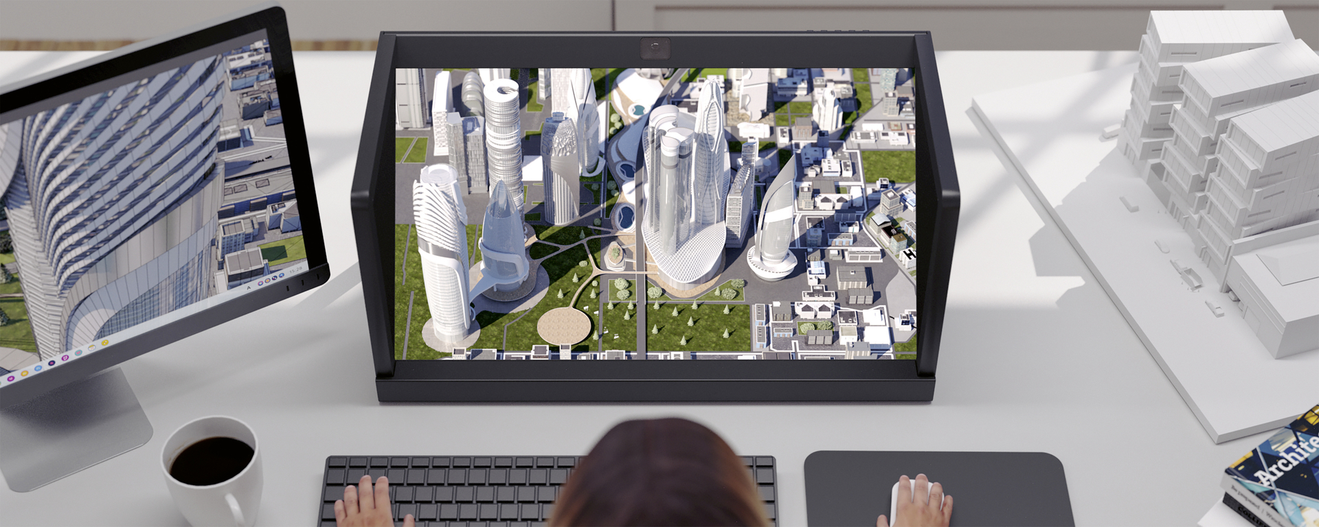 The ELF-SR2 monitor was developed to meet the needs of industries that rely on the display of 3D images: the 27" 4K display offers an immersive experience without 3D glasses or a VR headset, from any viewing angle. Thanks to a special algorithm, it processes content in real time without delay. The fan and speaker openings are built into a louvre structure at the rear, with the edges designed to be narrower for seamless attachment to the stand and side panels.