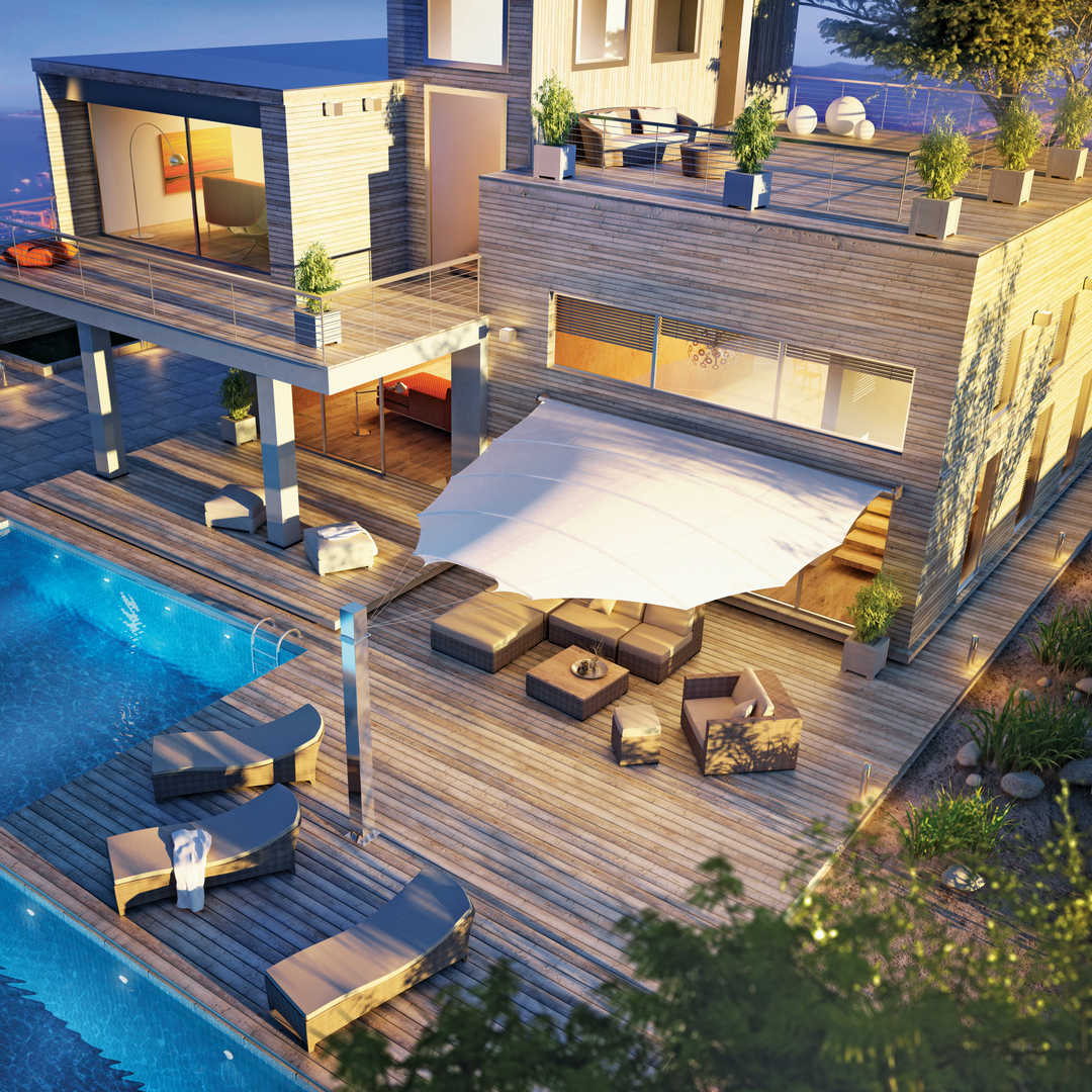 The elips4sun shade sail impresses with its spacious and dynamic shape. Its innovative construction enables a spectacular-looking 3D-dome arching system that lends the shade unusual functional properties. This sun shade is highly robust and resistant to all weather conditions. Featuring the aesthetics of an art object, it is a true eye-catcher in almost any garden.