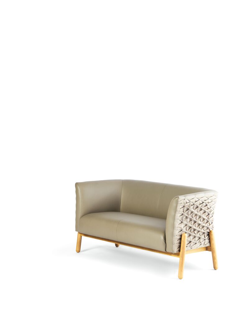 A traditional sewing technique was adopted for the design of the Embroidery Collection sofa to create an innovative approach in the furniture industry. Using a technique called smocking, the fabric of the backrest is crimped by parallel stitch lines. The resulting relief-like structure has a pleasant feel and creates a detailed impression that contrasts with the reduced form and smooth leather interior. In combination with the light wooden legs, the sofa conveys a modern look with individual details.