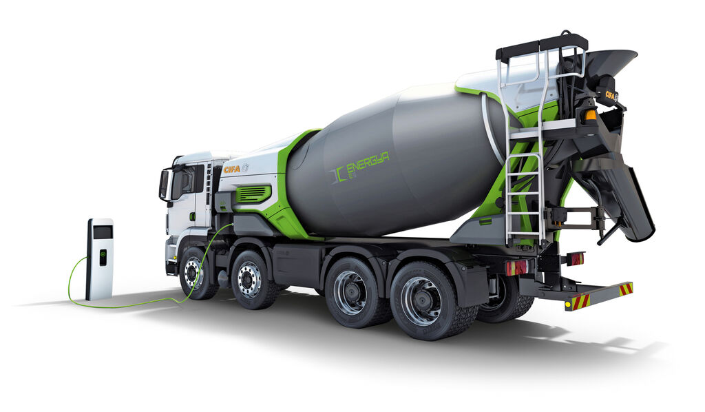 Energya E9 is an innovative hybrid truck mixer for concrete, whereby fuel consumption, exhaust emission and noise pollution are considerably reduced. In lieu of a hydraulic system, the drum movement is actuated via a quiet electromotor driven by a batch of lithium-ion batteries. These can be charged not only when idle but also via the vehicle’s diesel engine during transport.