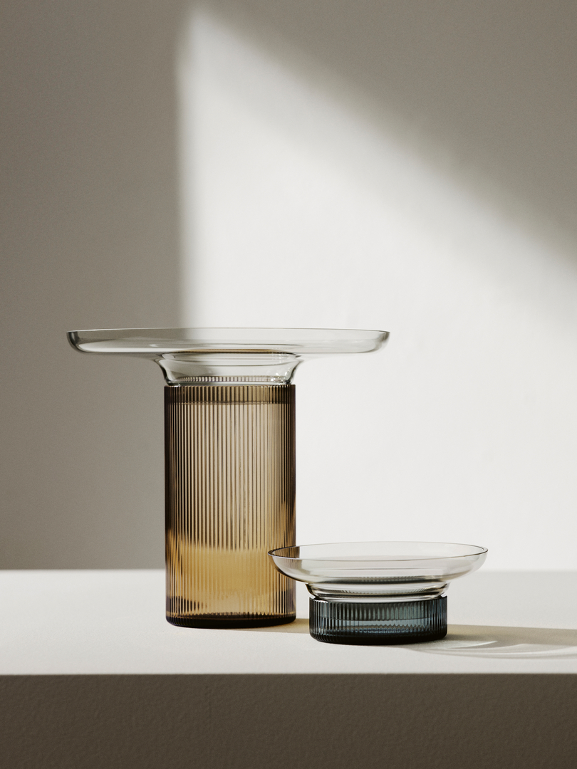 Ensemble is a collection of elegant glass table centrepieces that can be used in a variety of ways. The base height varies across the three variants and all feature a vertical groove pattern, which emphasises the series character and refers to architectural elements. The attached bowl, on the other hand, is equipped with a central opening to also serve as a vase. Crafted in subtle colours, the objects harmonise with modern interior styles and provide stylish accents both individually and as a series.