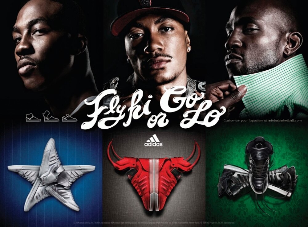 Advertised in this adidas series is the Equation, a basketball shoe that can be worn flexibly as either a high- or low-top. The striking visual language utilises pictures of popular basketball players, together with their chosen shoe, as positive image transfer. The distinctive design concept enables athletes to express their own personal style. In emphasising this feature, the product images were designed using the contours and colouring of the respective team logos.