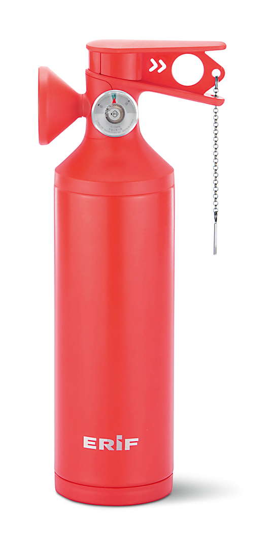 The Erif fire extinguisher – the name is an anagram of “fire” – is the result of the comprehensive development of a new product. Boasting a striking colour, the extinguisher features a design which has been reduced to the essential. In order to facilitate operation as much as possible, the conventional safety pin and seal were replaced by a safety bar. Thanks to this easy and intuitive mechanism, paired with a funnel-shaped aiming device which gives off the extinguishing foam, even inexperienced users can put out a a fire quickly.