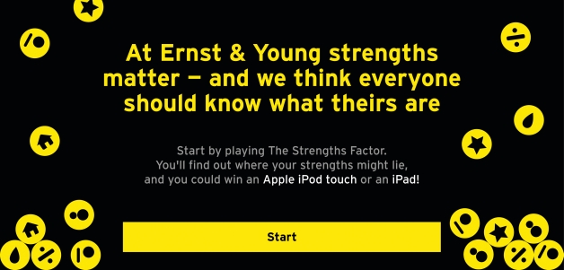 Operating on a global level, the accountancy firm Ernst & Young required the development of an online game which would enable the company to find the best possible employees and win them over. One specific requirement was a concept that would raise the company profile and create a buzz amongst graduates. To achieve this, an online platform consisting of a series of puzzle-based games was created to test the graduates’ individual strengths rather than relying solely on their academic qualifications. The games were simple and fun to play, with an eye-catching black and yellow palette, bold typography and iconography. Each graduate’s individual strengths were assessed and their overall score based on the games completed, with their strengths ranked in a league table.