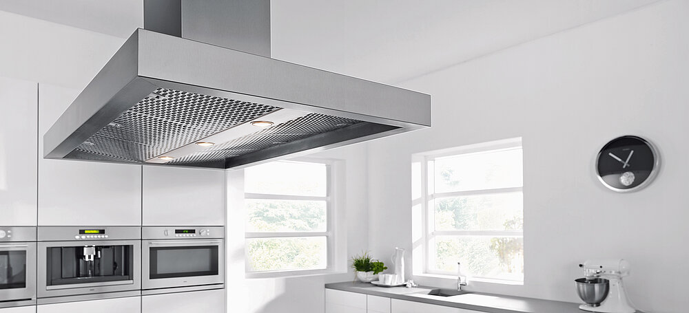 A design principle which follows professional functionality is a characteristic feature of this island hood.