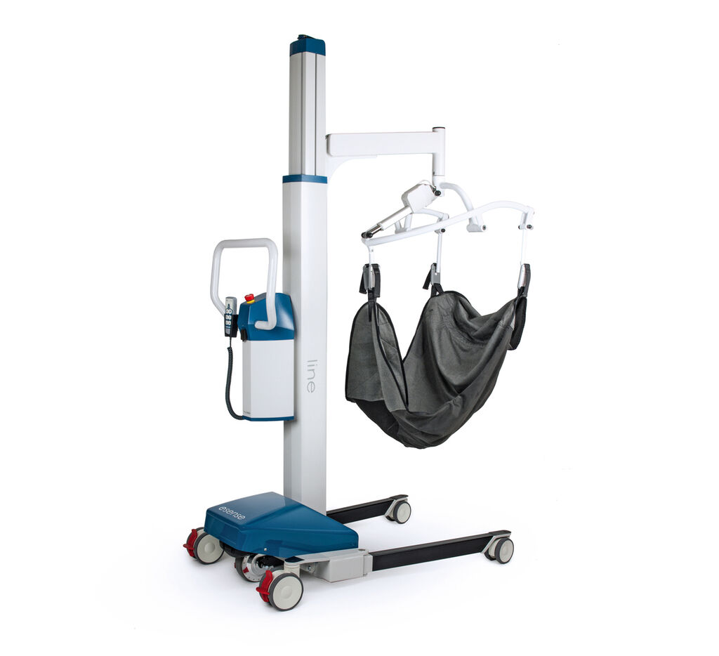 The design of this patient hoist looks light and sturdy at the same time. Its blue details lend it a highly distinctive appearance.