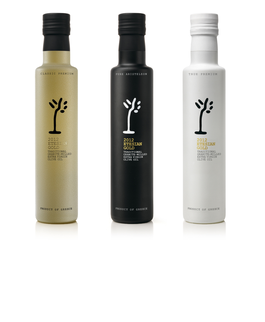 This premium product is mainly marketed in the Far East, where olive oil is also considered a cosmetic item. To address the target group with specific semiotics, the design recalls symbols from the oldest civilisations. As a product from an ancient land and from a sacred plant, the “Etesian Gold” is provided in an elegant bottle. It is sealed with a symbol from an ancient Greek syllabic script that means “olive”. Colour tones and hues are reduced to a discreet palette of earth colours.