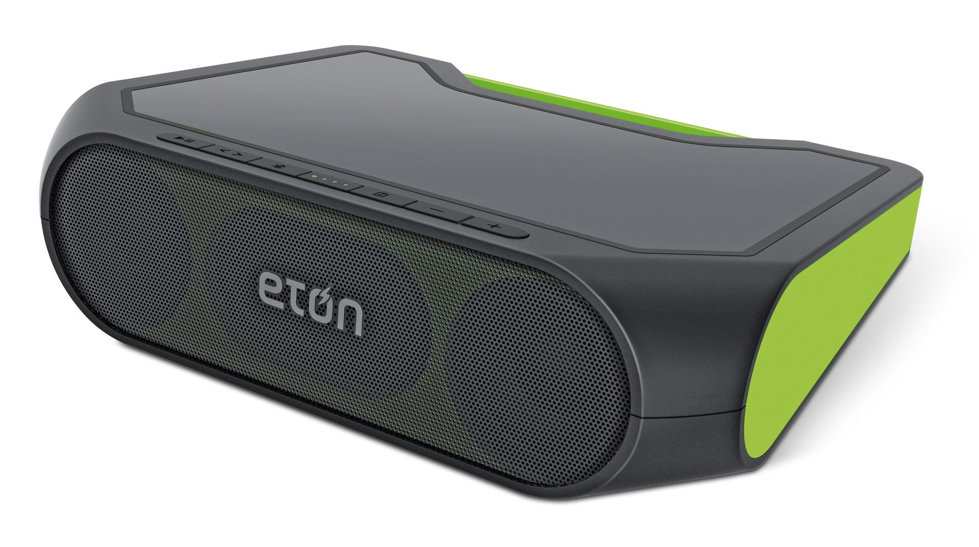 The Eton Rukus Xtreme Bluetooth speaker features a solar panel generating enough energy for the entire day. In addition, the internal rechargeable battery provides power for another 12 hours. Its robust housing consists of shock- and splash-proof plastic and rubber, making the speaker particularly suitable for outdoor use. The handle at the narrower end of the speaker serves as carrying aid or as an attachment for a backpack or tent. When the speaker is connected to a smartphone via USB, it charges the device with its internal rechargeable battery.