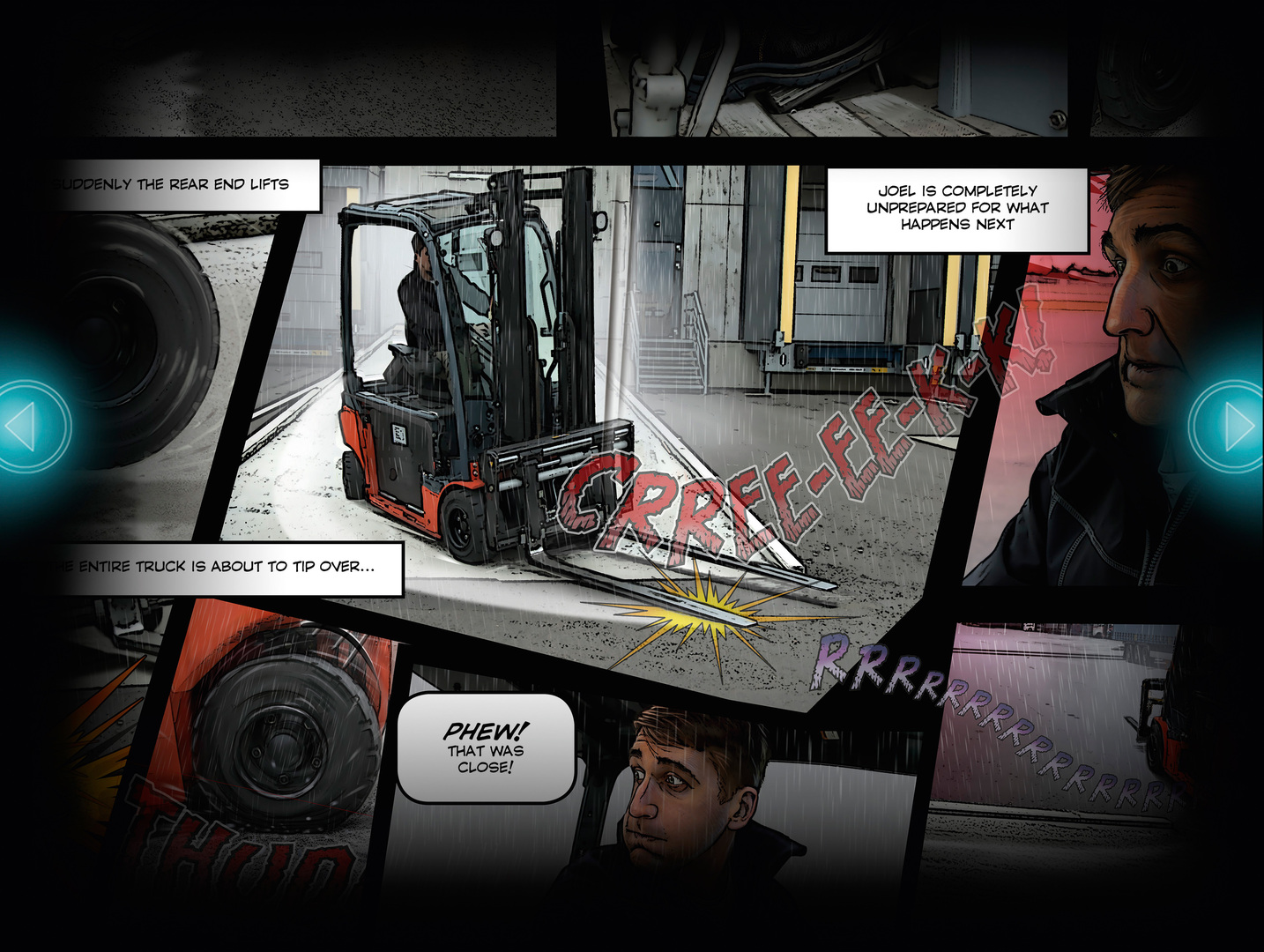 This Swedish e-learning programme convinces with its playful approach. Featuring an easyto-grasp language and navigation, as well as an aesthetic inspired by comics, eTruck manages to consistently reach the target group of prospective forklift truck operators who either have limited knowledge of Swedish or difficulties with the hitherto used teaching methods. In an engaging, easy-to-understand and highly efficient manner, the programme thus delivers on the theory and sensitises students for possible risks.