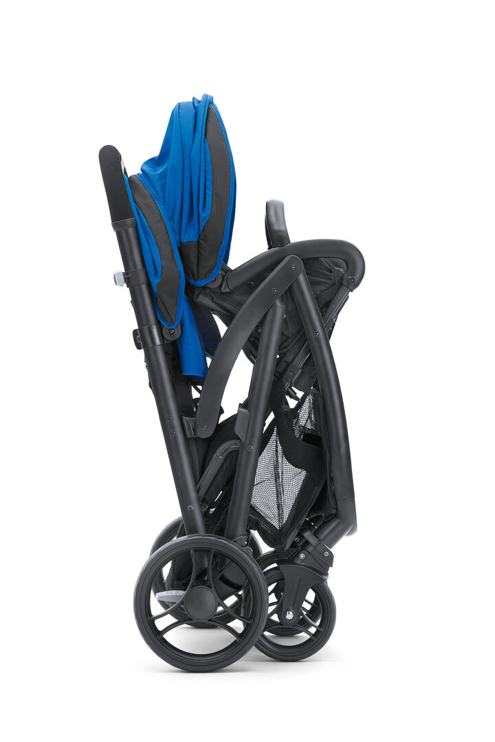 The special feature of the Evalite Duo tandem two-child pushchair is its low weight of only 11 kg. Furthermore, it can be compactly folded up with one simple hand movement, so that it takes up no more space than a normal stroller. Evalite Duo offers two fully-fledged seat units with several relaxing positions. For transporting younger children, the rear seat can be adjusted stagelessly to a fully reclining position. By means of an innovative spring lock, a baby shell seat can also be attached to the rear seat.
