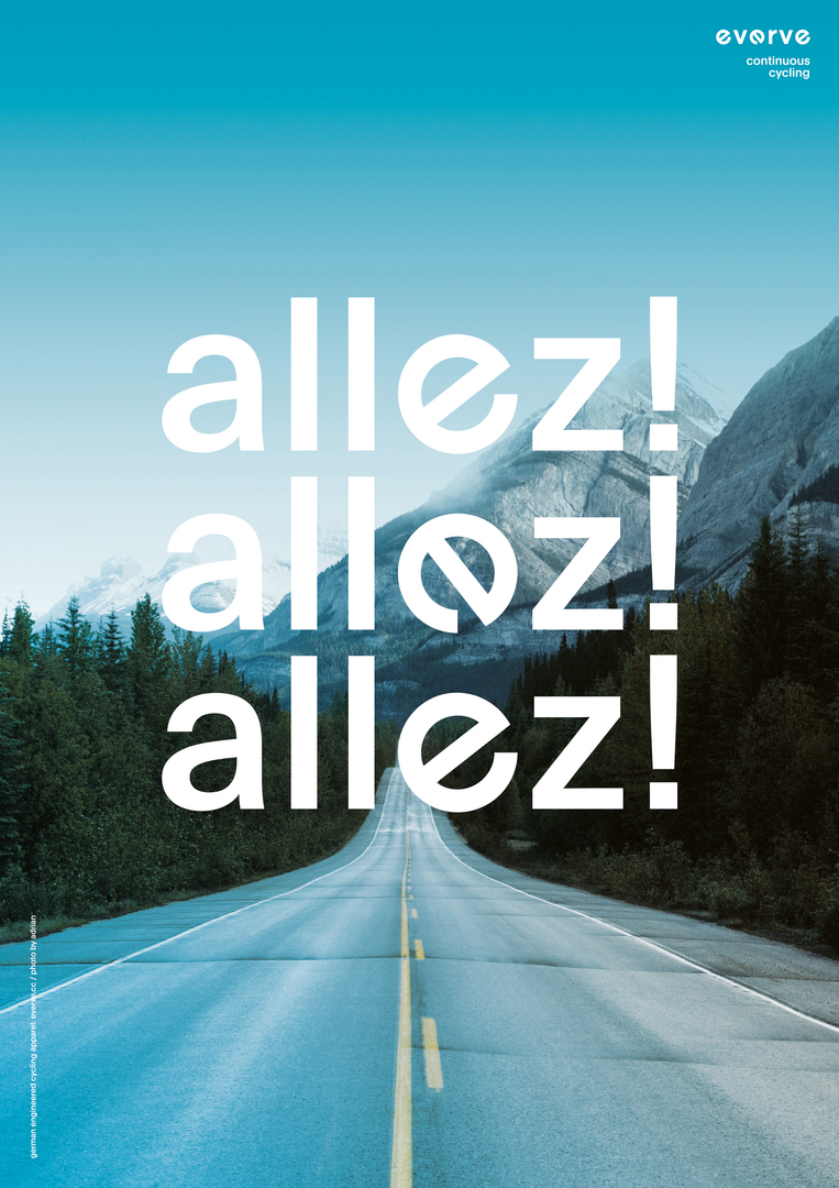 everve is a German manufacturer of cycling apparel which has its premium textiles manufactured in southern Germany. Its new corporate design, where a rotating letter “e” in the word mark serves as a central design element, was translated into a poster campaign. The three motifs have one thing in common: the rotating letter “e” is used as a concise brand signal in an individualised headline font. Combined with photographs of beautiful routes and motivating messages, the poster campaign is inviting and very attractive to cyclists. In order to enhance recognition, the photos are kept to a brand-specific colour palette.