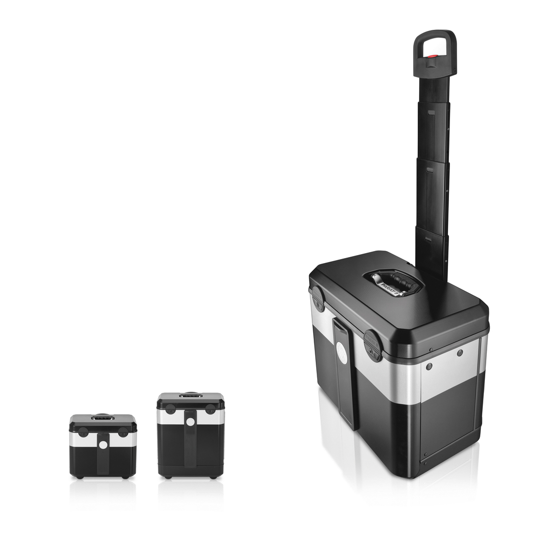 With a storage volume of 45 or 65 litres, this tool case allows users to reduce the number of cases they carry by at least one. Due to the innovative long-fibre-injection production process, whereby deep-drawn shells made of PX-ABS are backfoamed using fibre-glass-reinforced polyurethane, the case is extremely robust and even suitable for air travel. The 960-mm, extra-wide, four-stage telescopic handle made of powder-coated aluminium is ergonomic and ideally dimensioned. Rubber-coated wheels with ball bearings and a long wheelbase facilitate ease of movement.