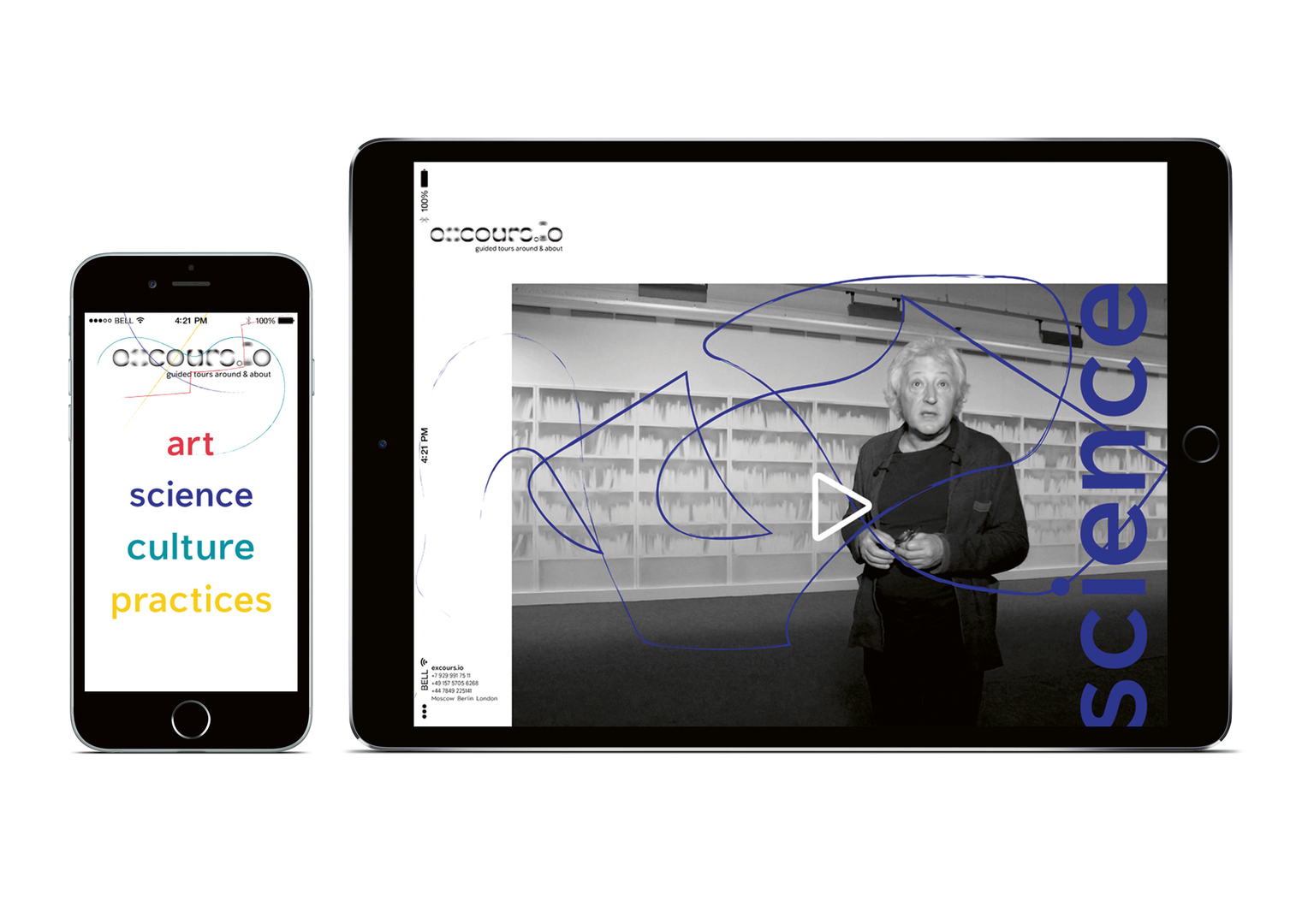 Excoursio is a project based in Berlin, London and Moscow providing museum experiences and guided tours online. Its corporate identity presents diversity, constant motion, flexibility and an individual approach towards each visitor. The four main subjects of art, culture, science and practices are colour coded. The logo is in constant motion and in search of a focus. Another eye-catching feature consists of coloured lines which are drawn by hand across all communication materials. In order to communicate the ideas of motion, flexibility and individual approach, the lines represent the visitors’ self-directed virtual tour through the exhibition space, which they tailor according to their needs and where they make choices from various options.
