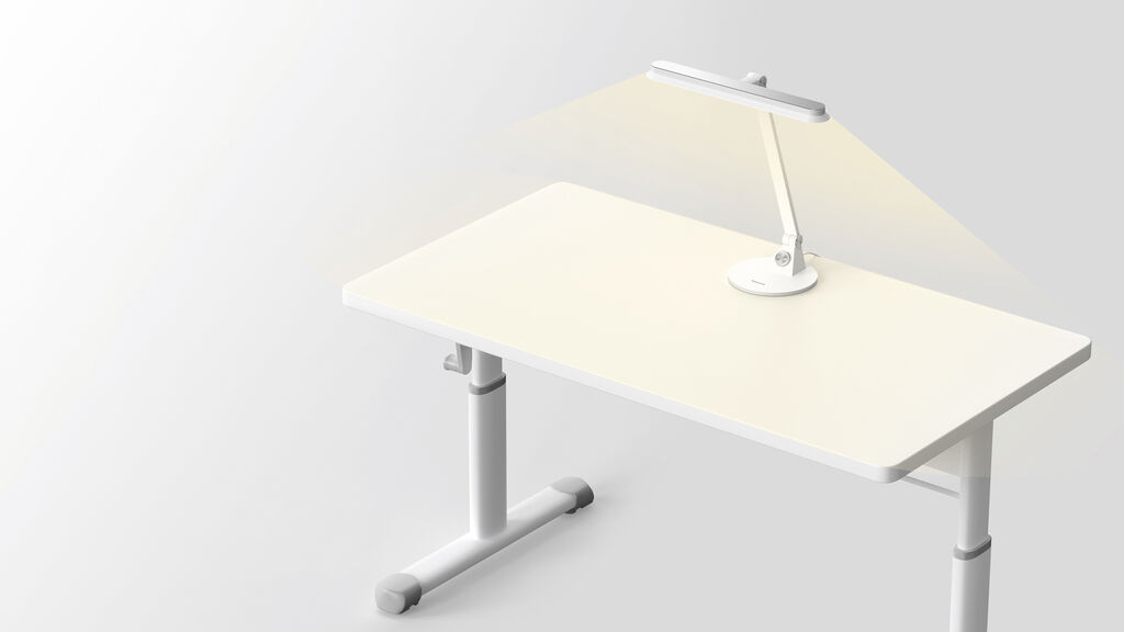 The Eye-Caring Table Lamp was developed to provide pleasant, natural light at the desk. With its anti-glare structure in combination with a wide, rectangular lamp head and an arc-shaped light-emitting surface made of high-density micro-rhombus crystal, it produces glare-free, evenly distributed light. An aluminium panel on top of the lamp improves heat dissipation and stability. The 4,000-kelvin colour temperature complies with international standards governing blue light and photobiological safety.
