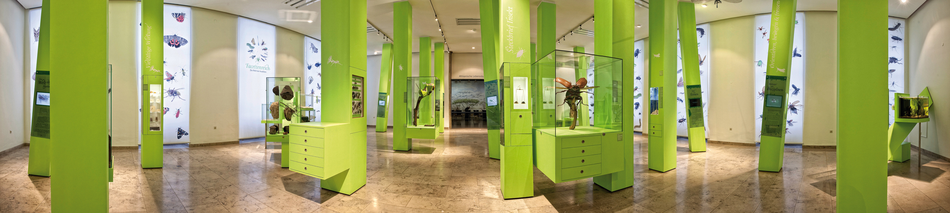 The re-design of the Entomology Department at the State Museum of Natural History Karlsruhe brings the diverse world of insects to life. Eight of the columns that formed part of the original architecture of the exhibition room have been integrated with the 26 twisted, bent or recumbent columns that today shape the exhibition space. 13 interactive sensor boards provide facts on 52 different subjects films, which can be called up by just touching the key word. The exhibition also includes a computer terminal, 50 drawers, covered displays, display cabinets, a revolving wheel, showcases, vivaria, mounted insects, large models and three audio stations.
