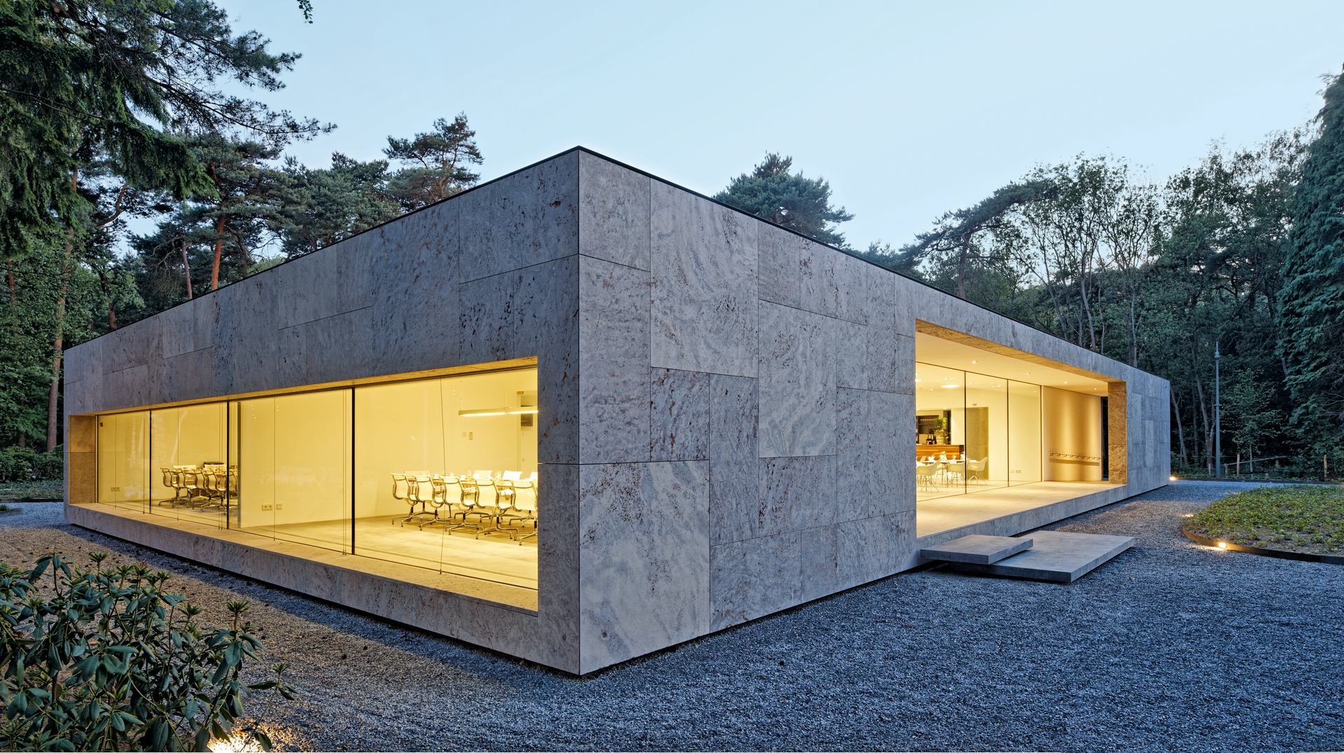 Tilburg University has extended its campus by realising the Faculty Club, a multipurpose pavilion for academic staff and their guests. Shift architecture urbanism took the opportunity to reactivate the quintessential quality of the campus: distinctive free-standing buildings in a green setting. The Faculty Club is designed as a carved-out monolith, one simple box in which transparency and massiveness melt together. The point of reference was the monumental modernism of Jos Bedaux, who designed the University’s first buildings in the 1960s. The result is a building that is solitary, yet part of the University.
