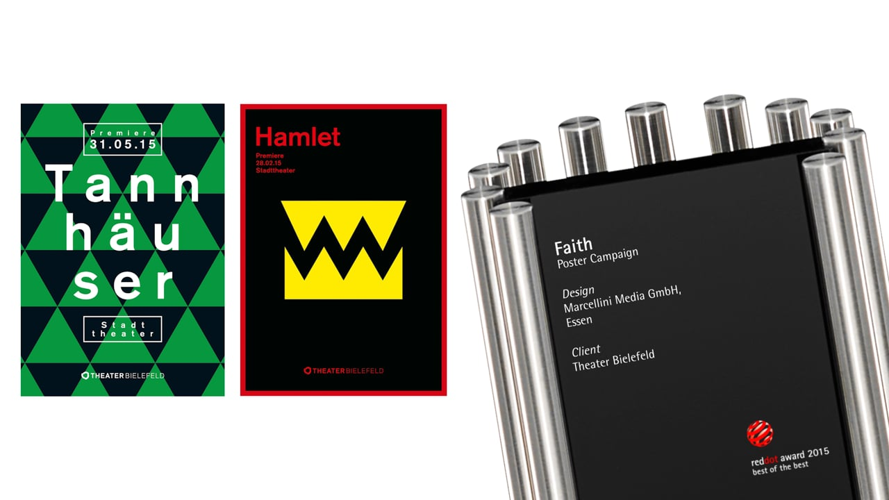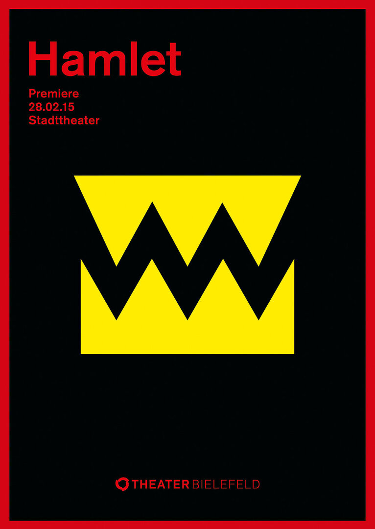The poster campaign for Theater Bielefeld appeals with its striking image concepts that are both eye-catching and intriguing. They subtly summarise the content of the plays and are unmistakable in their message. The playful use of basic graphic shapes and the plain, clearly legible typography transport the key concept of the design identity in a very appealing way.