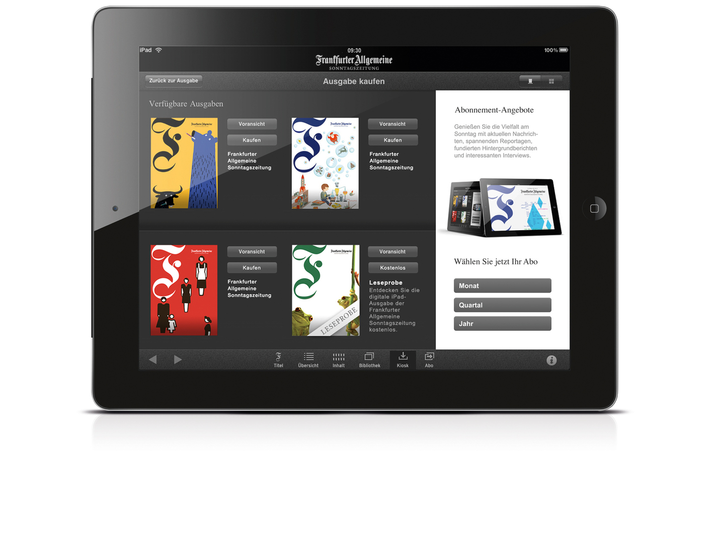 The high-quality journalism and visual design of the Frankfurter Allgemeine Sonntagszeitung, launched successfully just ten years ago, provided inspiration for the concept and design of the F.A.S. iPad app. A high demand placed on layout and design is apparent throughout the entire application, offering a user-friendly navigation experience that provides access to a broad spectrum of content. Each of the presented articles is designed with loving attention to detail. The clear focus is on the optimal reproduction of the articles, enriched with small, sophisticated animations.