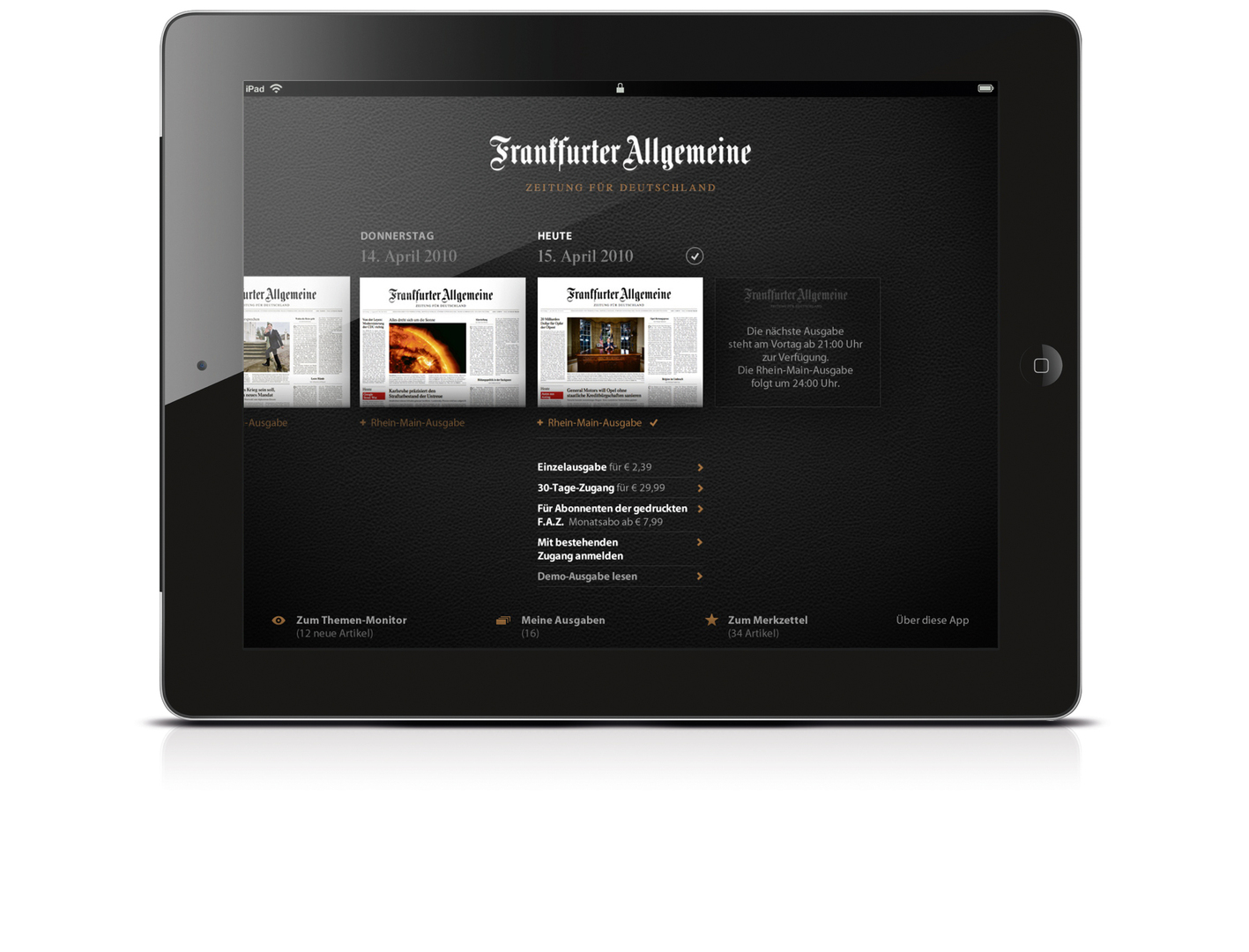 The claim made by the Frankfurter Allgemeine Zeitung, commonly referred to as the F.A.Z., that it is a newspaper offering high-quality journalism for decision-makers in politics and business is also reflected by this iPad app. It places the daily print edition centre stage and underscores this focus through a navigation bar situated above the respective newspaper pages. Highly functional features that enhance the reading experience include an article-reading mode, a topic monitor and a notepad. Rounded off by an archive feature for older editions, the app represents a well-thought-out symbiosis of classic newspaper experience and digital research tool.